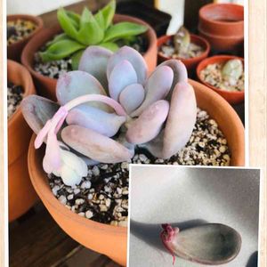 昨年10月に買ったおそらく月美人のカット苗さん花芽が伸びてます。 この後どうなるんだろ…? そして試しにやってみたこの子の葉挿し。発根したので鉢へ引越しました。 春にむけてどう変化するのか楽しみ。