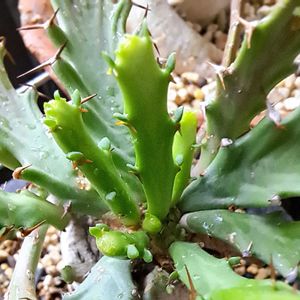 おはようございます🙋 我が家のユーフォルビアの飛竜さんの先っちょから小さな新芽が出てます😆かわゆすね💕 エガチャン 「うぉ~ここから出てるぞ!こっちこっち」 ツンツン👉グサッ💥 エガチャン 「ギョエ~」👀 小っさくてもいっちょまえに棘があります🤣 気を付けましょう🙇 エガチャン 「気を付けなはれや!」(´Д`) ( ´艸`)🎵エヘヘ