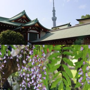 亀戸天神様とスカイツリータワーと藤の花💜✨ 亀戸天神様では藤祭りでとても賑わってました