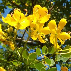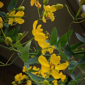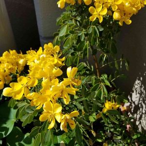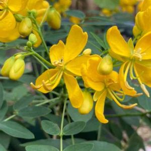 【ハナセンナ】 黄色い花が風に揺れてたわわに咲いていました。 見たことない花で、調べてみると「ハナセンナ」別名「アンデスの乙女」✨✨ 夜になると葉が閉じるそうです。 花のシベが野牡丹に似ています。かわいいお花でした😌💕💕