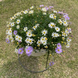 すぐ楽星空マム バニラ&ソーダとビオラの寄せ植えです。鉢からあふれ咲いてきました。小花だけどたくさん咲いて綺麗🥰