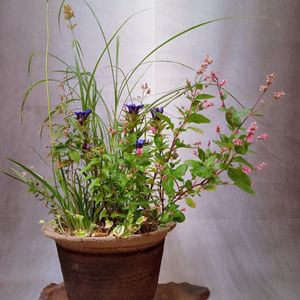 秋色の寄植えです🌿🌾🌸 濃色リンドウが 遅れ馳せながら咲き出してくれました 🌿🌾🌸 濃色リンドウ、岩ショウブ、丸葉アイタデ、乙女ギボウシ、 ボントクタデ、ススキの寄植えです🎶