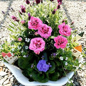 昨日、GS花友さんからいただいたガーデンピック、さっそく寄せ植えに刺してみました *カーネーション *フレンチラベンダー *ラベンダー *カーペットカスミソウ *アゲラダム 今朝もですが、遅霜が怖くてなかなか外に出せません