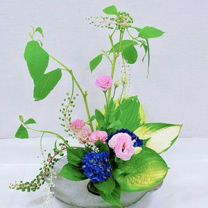 こんにちは😃 今回の生け花💐 ヤマゴボウの葉っぱを取れるだけ取って、曲がり具合を見せるように生けてみました🌿🍃 先生にギボウシをひとまとめに手直ししていただいて、めんこく仕上がりました🩷💙💚 …先生、写真、お借りしました🤳🙏💦