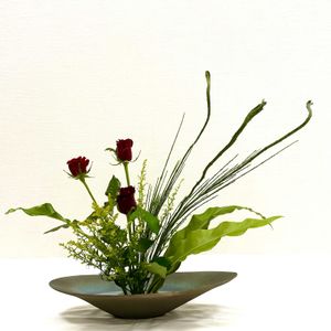 こんにちは😃 今回の生け花💐 エニシダの間隔とバラの位置がいいと先生に褒められました😊 ソリダコは手前だけにしていましたが、前後と真ん中の位置にひと枝入れていただいて、つながっているように仕上がりました😃✨