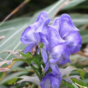 カワチブシ(河内附子) キンポウゲ科トリカブト属の多年草 別名 オオダイブシ(大台附子) 分布 関東~近畿地方の太平洋側 沢沿いの登山道に、ポツポツ、咲いていて、数は少ないですが、目立っていました。 トリカブトの仲間で、花、葉、根など、どの部分にも強い毒性を持っているそうです。 河内の金剛山(河内と大和の国境)で発見され、トリカブトの根のことを「ブシ(附子)」と呼ぶことから、カワチブシと名付けられたとのことです。 花びらに見えるのは、萼片だそうです。 変わった花の形ですが、蜜は、上萼片の一番奥の距にあり、そこに、もぐり込んだマルハナバチを2枚の側萼片が抱いて、受粉が効率よくいく構造になっているそうです。
