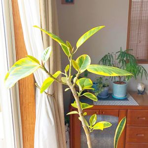 フィカス アルテシマの本体で〜す。 部屋置きです。 カットした後の猛暑でも外置きしていましたら、葉っぱの斑がいい色になりました☺️ 一部、紐で引っ張って樹形を整えています。😅