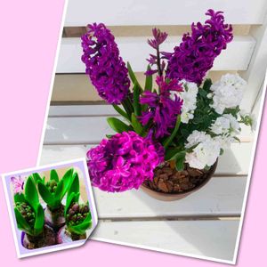 おはようございます(✿︎´ ꒳ ` )♡︎ ヒヤシンスの球根 ビフォー💓💓💓 アフター💜💜💜 2か月経って満開です🌸 鉢替えしたので安定して 良かったです🙋♀️ 大人も風の子🎶 頑張りましょう😁✌️