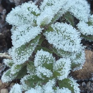 野バラの葉っぱに霜柱🥶🇳🇱 明日からやっと寒さが緩むとのことで近くの湖に氷が張ってるかお散歩がてら見に行って来ました。残念ながら人間さんが乗れる程の分厚さはなく、今回の寒気でのスケート⛸️は断念😣 湖の近くにある野バラの葉っぱ🌿にぐぐぐっと寄って撮ってみました。少し前の凍りマムもそうですが、パッと見雪が積もったように見える植物達、拡大してみるとこんな風に霜の柱?が乱立しています😁大阪ではこんな風になってるの見たことないんですが、日本でも寒い地域だとこんな風になるんでしょうか🤔?