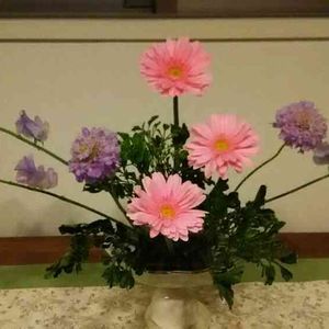 今日はお稽古できなかったので、お花だけ持ち帰り。先生の手書き説明と、お友達が送ってくれた写真を見ながら、四苦八苦。スカビオサが2本しか無かったから、開く部分はスイートピーだけど、良かったか…? 春らしくてかわいい。うれしいな。