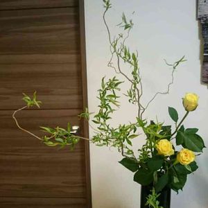 こんばんは☺ 今日は、久しぶりのお花のお稽古でした❗ 冬に、葉っぱの無い雲龍柳も よくいけますが、 やっぱ、植物は、葉っぱが命💚 葉っぱが美しい植物が、好き♥ 黄色のバラと相性がいいです☺