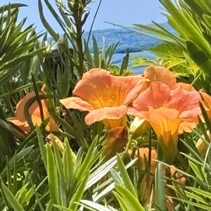 ノウゼンカズラ 我が家のは、イヌマキの木に張り付いて咲いているのですがテッペンなのであんまりよく見えません。🙄🤔👀⁉️ なんだか海岸近くの景色🫢🌴☀️🏞️みたいになってる気がします。笑