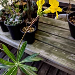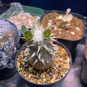 パキポディウム・ラメリー。 マダガスカル南部原産の砂地に自生している 塊根植物。 硬い表皮から長く鋭いトゲがビッシリ生えており その鋭いトゲも成長するに従い徐々に無くなっていき成木になるとツルッとした表皮になる😱 大きく成長しないと花は咲かないけれど大きな花を咲かせるそう。 直径8cm程の青白い花を咲かせ とても良い匂いがするそう。 青白い花も見てみたいけど 匂いも嗅いでみたい🤗