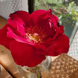 つるバラの『オランド』が咲いてくれたので、窓辺に連れてきた(⁎˃ᴗ˂⁎) 一輪で、お部屋が良い香り♡