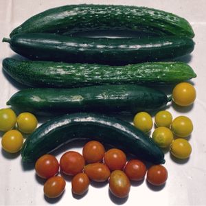 今日の収穫!! キューリ 5本(43本目) ミニトマト 8個(123個目) 中玉トマト 1個(10個目) シシトウ 4個(14個目)