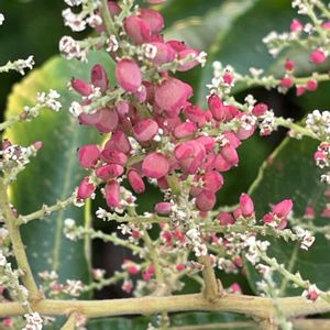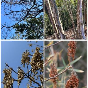 1/31 山歩き🥾 ここでも「リョウブ」の木がたくさん生えています🌳 ⬆️2枚がリョウブ、果実も花の残骸か実なのかよく分からないような姿です。この幹は太くて樹皮の剥がれの斑が大きいですね ⬇️2枚、質問がありましたので、ハゼノキとヌルデの果実をあげておきます。ともに房も立派で、果実がリョウブよりずっと大きくて扁平な球形の姿がハッキリと分かります。 ヌルデは熟したばかりの時は、塩の塊みたいなのが果実にまとわりついています。いわゆる「ヌルデ塩」リンゴ酸カルシュウムの結晶で昔は塩の代用になったものです🤔 リョウブの果序が大きい時はこちらの方に似てるように見えるかもしれません。