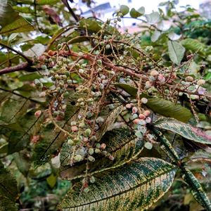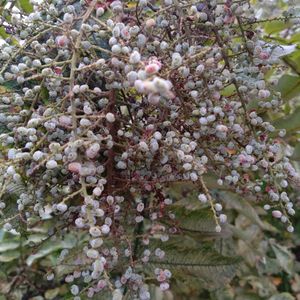 ヌルデ(白膠木、塩膚木) ウルシ科ヌルデ属の落葉小高木。 ⚪︎ウルシほどではないが、まれにかぶれる人もいる。 別名: フシノキ、カチノキ(カツノキ)。 葉にできた虫えいを五倍子(ごばいし/ふし)生薬名である。 北海道〜沖縄の平地から低山地の林縁にふつうに生える。 高さ5〜10m、直径10cmほどになる。樹皮は褐灰色。枝ははじめは黄褐色の毛が密生する。 特徴: ①や⑤の画像: 花は泡を吹いたような形。 直径2㎜ほどの可愛い花をつけていました。 葉はいくつにも分岐し、葉軸に、葉と同じ緑色の翼が発達していて個性的な感じでした。 ②、③ヌルデの果実: 特徴 : ヌルデの果実は直径約3mmの扁平な球形で、秋に黄赤褐色に熟します。 熟すと表面に白いリンゴ酸カルシウムの結晶が析出することがあり、舐めると塩辛い味がします。このため、「ぬるで塩」と呼ばれ、かつては塩の代用とされていました。 利用 : ヌルデの果実は、脂肪分と塩分を含んでいるため、冬の餌が少ない時期にはシジュウカラ、ツグミ、ヤマドリ、イカル、ジョウビタキ、シロハラ、ヒヨドリなど多くの野鳥にとって貴重な食料となります。 また、果実を日干ししたものは「塩麩子(しおふし)」という生薬としても知られています。 ※ウルシかぶれするので塩味は試せません😞