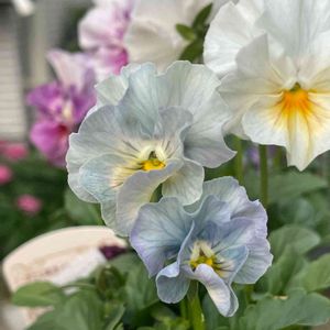 ジョイフルでお迎えした 〝フリル咲きパンジー シエルブリエ〟 やはり色変わりしています 薄い水色 持ち手の左側と右側で少し色合いが違うんですよ👍 かなり似ていますが…(*´艸`)𐤔𐤔 こんなに優しい色で咲くのですね💙