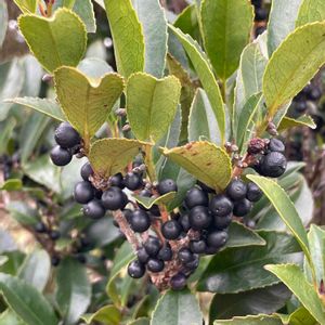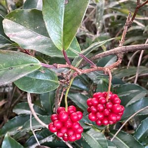 2021/11/28撮影 イヌツゲ 常緑低木〜小高木 モチノキ科モチノキ属 ツゲの実かと思い調べてみたら、ツゲとは異なり、イヌツゲのようです。 ヒサカキの隣りに生えており、ヒサカキより葉が小さく、実は大きい黒。 ツゲの実は、ちなみに黒では無いようです。 偶然、イヌの名前が続きました。