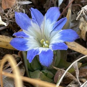 2022/1/3撮影 今年の初リンドウは、思わぬ早くきました。 根生葉は、ロゼット状で、ハルリンドウとしました。 日当たりのいい冬枯れの草原の中の道端、一輪のみ咲いていました❗️ 昨年より、2ヶ月以上早く驚きです。 他のリンドウは、まだ蕾にもなっていないようです。 今年は、こちらは、暖冬では、ありませんが、小春日和が多いです。