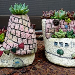 こんばんは😃🌃 今日モルタルハウス鉢が届いたので…… 寄せ植えしました☺️😉💦 寄せ植え中々難しいですね😆