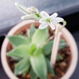 我が家で初めての開花です𓆸⋆* ハオルシアの花は鑑賞としては………。 と聞いていましたが可愛いぞ? 派手でも華やかでもないかもしれないけど 白覆輪みたいで可愛い♡