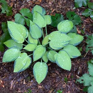 ホスタ ジューン 今日は雨でしたが、雨粒を乗せたホスタが美しく、思わず写真を撮りに庭に出ました♪ 昨年苗が届いた時は、思ったよりも黄緑っぽい色でしたが、2年目になって青みが増して美しくなりました✨