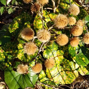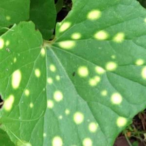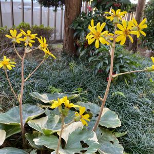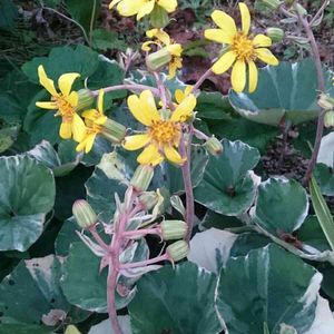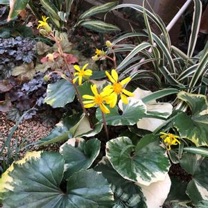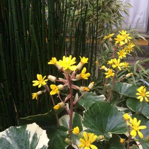 ツワブキ。英名はヒョウの植物って意味で、Leopard plantって言うらしいですね。斑入りの葉のツワブキから名付けられたようです。
