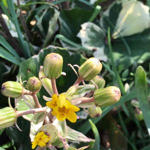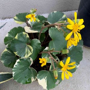 斑入りの石蕗 ✨ つわぶきちゃん やっと開きます つぼみも、もう開きますよ〜❗といっています♡ 花色が、緑一色のつわぶきより優しい感じです😊 いつの間にか水仙が一緒に生えています😊😊😊