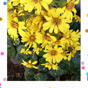 秋の黄色💛 集めてみました🤭🎶 ↖️モリニュー ↑宿根マリーゴールド レモンマリーゴールド 小さな花で葉がレモンの香りがします🍋 ↗️斑入りツワブキ 他のツワブキより遅れて咲きました🤭💦 ↘️プリペット 庭を明るくしてくれます🎶 ↓メランポジウム まだまだ元気に咲いてます🎶 ↙️野菊 繁殖力旺盛な元気な小菊です🤭 可愛らしい黄色達💛💛💛