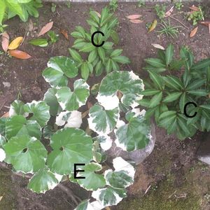 庭に植えた植物ですが、マダラ模様の植物は何でしょうか?