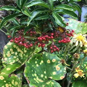 今日のお花 ツワブキ 斑入り 雨に濡れて 艶々綺麗な葉っぱ💫 台風の進路、太平洋の海上を進んで行って欲しいな! 防災メール、厳重警戒して下さいと来ました。もう一度、庭を見回って飛びそうな物とか倒れそうなの固定してこよう🌱🌿🌸🌺💨💨