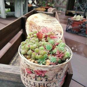 雨は上がったけど庭仕事をするような気候ではない祝日。 朝から作ったリメ缶に、別の鉢で徒長してたセダム達を寄せてみた。 きちんと洗ったはずなのに、さば缶の匂いが取れてなくて😑 さらに油性ニスの匂いも付いて🖐が臭い…