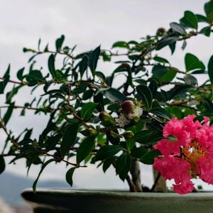 姫百日紅ついに開花 昨日夕方まで、咲く素振りもなかった姫百日紅にピンクの花が開花。 咲きそうな兆しがあった白花は、他の蕾に押されてこれ以上開花できないかもしれない(2枚目)。