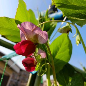 こんにちは👋😃 秋撒きした赤花さやえんどう🫛です 暖冬のせいか背丈より高くなり花が咲きました🙆 可愛いお花が好きです😌💓 白花さやえんどう🫛よ り実は大きくなります☺ たくさん実ったら卵としにして食べたいな(笑)
