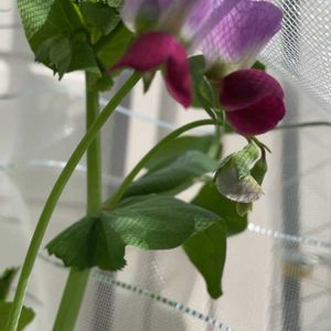2021-2-20(土)晴れ☀️ 気温が上がりましたー 風が強くてネットが揺れますが.......サヤエンドウの花が🌼🌸ひとつ開きました❣️赤い花の方😃です✨キレイ😍