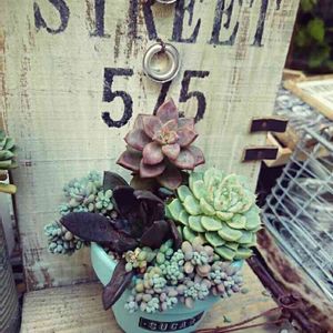 近所のホームセンターでなんと、Ayumiさんの木工雑貨があったので、早速寄せ植えしました🌵 何度もみてもカッコいい〜〜♡