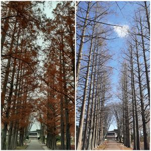 メタセコイヤ ⬅️12月 ➡️1月 葉が落ちてスッキリ 天に向かって真っ直ぐに伸びていくんですね 見ていて気持ちがよかったです モズが枝に1羽止まっていました