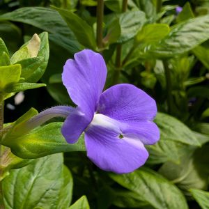 今朝の庭 一花 青紫の花弁 真ん中は白 ブラジル原産で 大阪花博で導入され普及 花姿を猫の目に見立てて 名前は ブルーキャッツアイ