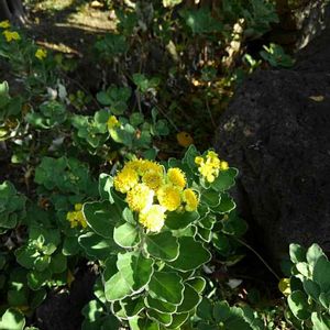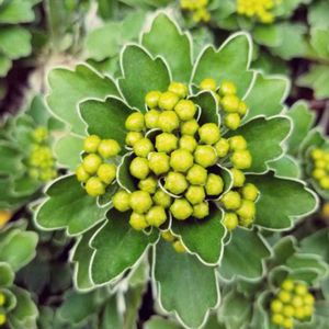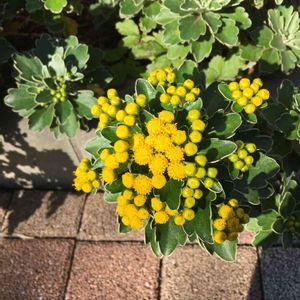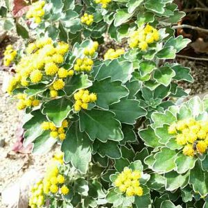 ご近所さんに咲いてるイソギク。 隣のお家にあって変わった葉っぱだなぁ〜と何か分からなかったけれどGSで見かけるようになって名前が分かりました。 もう一件隣のお家にも咲いていました。 変わったお花です 花びらがなくて真ん中の丸い部分だけです。 葉っぱの白い縁どりも可愛いです💛