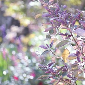 葉っぱの裏の紫が萌えポイントのミツバハマゴウプルプレア。 小さな実がついています。葉っぱも黄色になり、落葉が始まっています。外で冬越しされる方もいらっしゃいますが、私は冬は屋内に取り込んでいました。今年も、そろそろかしらと思っています。
