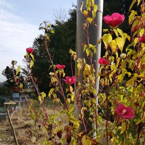 富士山の近くの、花友さんの田んぼの土手には 赤いタイタンビカスの花が沢山植えられてます