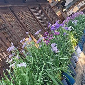 諏訪大社下社 春宮にて 地元のあやめ会の皆さんが奉納しています。あやめやハナショウブおよそ80鉢がぐるりと並べられています🍀 今日も暑い日でしたが境内は涼しい風が通って気持ち良かったです🍀😌🍀