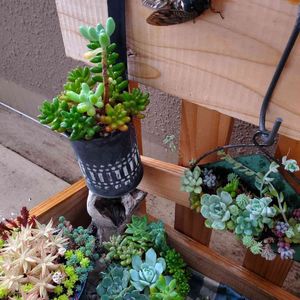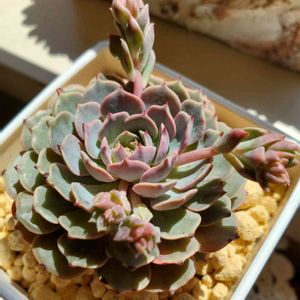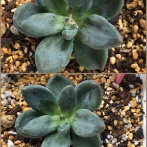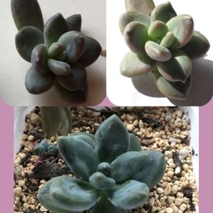 この子の色結構好きなのよね~💕 1月にポチッした中に入ってて お名前が未だにわからない😥 ↖️お迎えした時は紫色を黒くしたような? ちょっと例えようがないような変わった色でしたね 今まで出会った事の無い色で見入ってました😊 丸くてプクッとしてる感じがするけど1つだけ平ペったい葉が付いてるのでゆくゆくはあの形になる子なんだろうな~と ↗️3月になると色が薄くなってきて黄緑色?に葉先だけ少し紫色っぽい? まだこの頃も丸ぽい感じが残ってる ⬇️そして今❗️ 平ペったい葉は取れて葉挿しからママに似たお子ちゃまが😆❤️ 根っこがすごーぃ❣️ ママも最初の平ペったい葉に少し近づいてきたね😄 少し凸凹してる?😳 環境でこうなったのかこういう子なのか😅 多肉さんのお名前探しはホントに難しい😫 春に一気に成長した子達と比べるとゆっくりだったかな~🤔 何だか君はかっこいい😎お名前のような気がするよ~😁💗 かっこいい😎お名前勝手につけちゃおうか🥰😂🤣 コレかもね!と分かる方いましたら教えてくださいね(❁ᴗ͈ ᴗ͈)” かざぐるまさん、みらいさんに パキフィツム 紫麗殿さんかも!と教えて頂きました ありがとうございました(❁ᴗ͈ ᴗ͈)” この子で🏷毎月13日と14日は葉挿しの日に参加させて頂きます😊