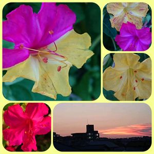 散歩道のお花 早朝散歩で綺麗に開いたオシロイバナに出会いました✨🤍💛💗❤️ 昨日の夕焼け🌆 少し焼けていました 🏷️日曜ビタミンカラー♪ 🏷️しべ好き 🏷️夕焼け 🏷️コラージュ仲間達 に参加します🎵