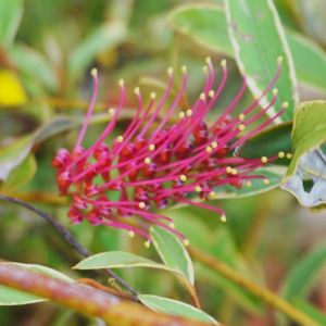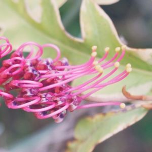 我が家も咲いてきました🌺😁 斑入りのグレヴィレア🎵🌿 枝垂れるように咲いてるので、高い場所に置かないと目立ちません💦