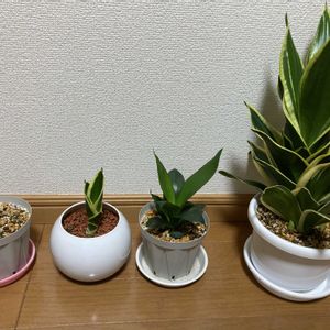 【サンスベリア】の家族🧑🧑🧒が沢山います。1番右が親株です。 (葉挿しもいれば、株分もいたり) “サンスベリア・ハニー”ですが、思ったよりも大きくなってきて、どーしようかと思っています😅 ②どうしよかと思ってるとこで、新たなる子株が、、、。 本当に大家族となりそうです💦