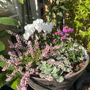 連投失礼します(⋆ᵕᴗᵕ⋆).+*ペコ 今日作った寄せ植え🌷🌸🌺🌻 ミニシクラメンの森の妖精さんに合う鉢を探していたらネットで可愛い鉢を見つけたので( 。・ω・。)ノ 凸ポチッ 早速寄せ植えを作りました(*´∀`)♪ 森の妖精さんに八重咲きカルーナのブルガリスさん、チェッカーベリーさんを合わせてみました😃︎💕︎ テーマはお花畑で戯れる妖精🧚♀️💫さん😋 自分で言うのもなんですけど、今回の寄せ植えはなかなかの自信作😁 可愛い1鉢が出来ました(*´ ˘ `*)♡エヘヘ