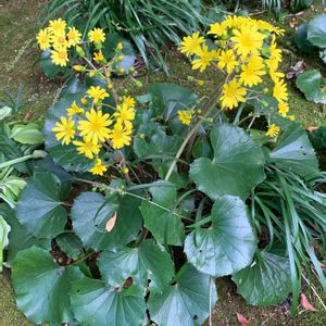 ツワブキ〜🌼 こっちはいい感じに咲いてます😆 まだこれからなツワブキです。 向こうに見えるのは、ヤブラン 実がたくさんついて真っ直ぐ立ってられないようです😅 キク科ツワブキ属