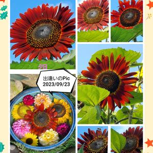 🌻花友 サスケママさんへ🌻 ㊗️2300Picおめでとうございます😆 いつも素敵なPicに癒されてます ㊗️Picは出逢った花手水にしました ↙真ん中の赤い花は、何ですか?とGS初日に💬貰ったんだよね 赤い🌻夕日で㊗️Picにしました🙌 来年は、また夕日の種を探して咲かせたくなりました 私に姉がいた?と思うほど、好きな色や花 コキア🧹や🌷🎒アドバイス貰ったり… 好みが似ていてビックリ。 これからも宜しくお願いします(*・ω・)*_ _)ペコリ